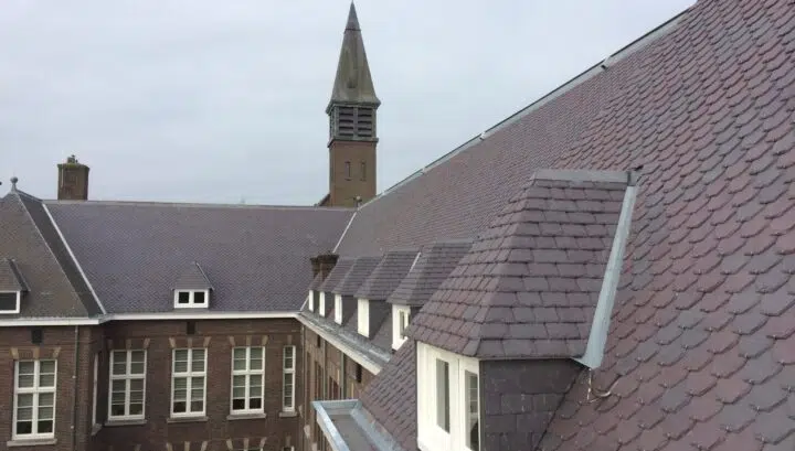 Afgelopen twee jaar heeft Leidekkersbedrijf Van de Kimmenade bij dit bijzondere project alle daken voorzien van nieuwe natuurleien. Omwille van de grote dakvlakken, was de opdrachtgever, Stichting Providentia, zeer gecharmeerd van de iets dikkere sortering Pernhyn. De keuze voor deze partij is eveneens gemaakt, omdat er een mooie kleurschakering in zit.  Ook al zijn deze natuurleien iets dikker, het detailwerk blijft mooi. Op de foto (rechtsboven) een mooie Franse vlechthoek.